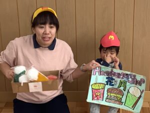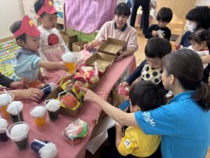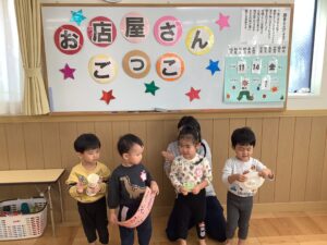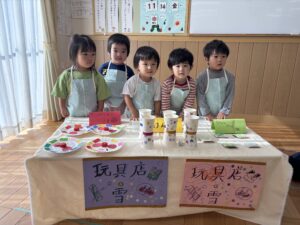 お店屋さんごっこ2025 2025.11.18 11月14日(金) お店屋さんごっこを行いました♪ 〜CM〜 月・花組:ハンバーガー屋さん 雪組:玩具屋さん 前に出てお店の宣伝を頑張りました✨ 園長先生:体験ブース 〜お店開店です!〜 「いらっしゃいませ」や「ありがとうございました」と元気な声が聞こえてきました♪ 楽しいお店やさんごっこでしたね✨ ハロウィン2025 前の記事 11月の誕生会 次の記事