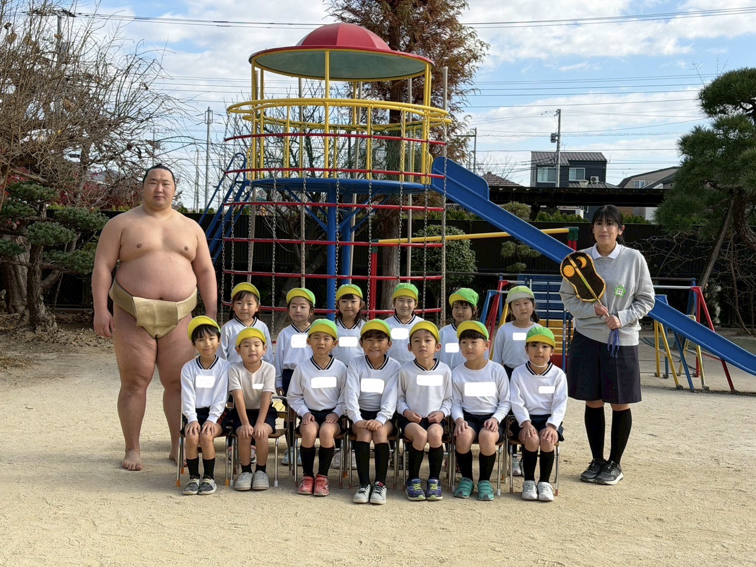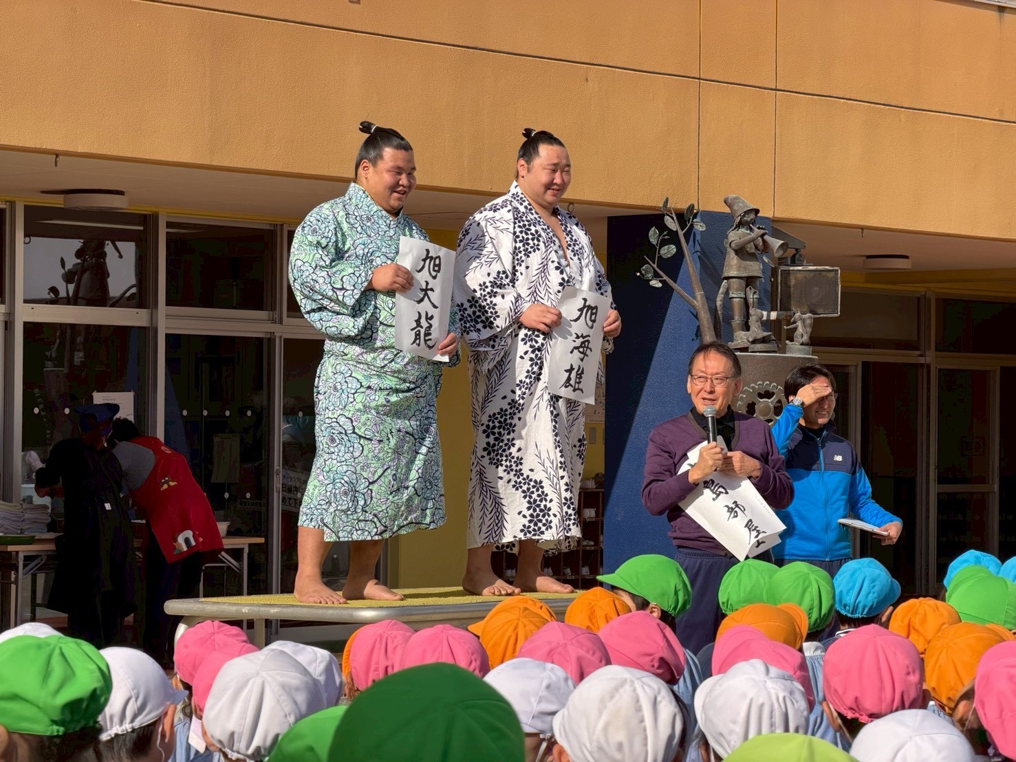 今年度は「旭海雄さん」「旭大龍さん」のお二人が来てくれ、お餅つきや相撲大会をしてくれました!