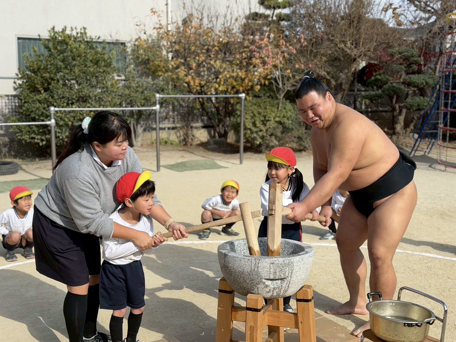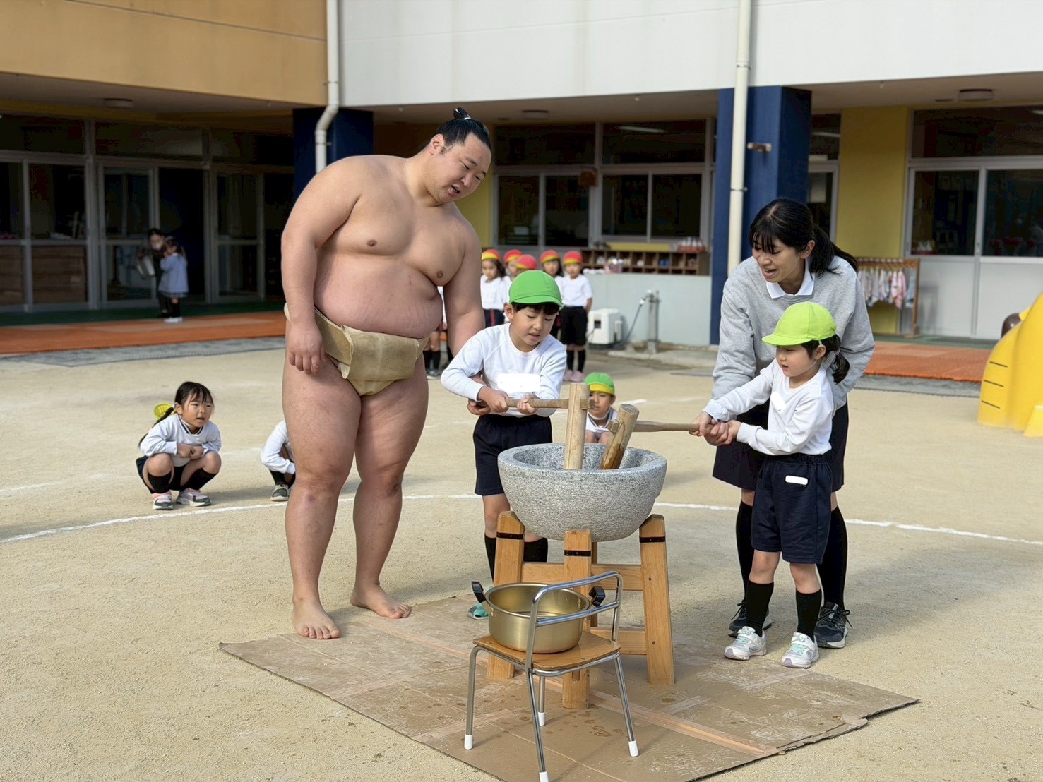 力士さんと写真を撮ったあとは、お餅つきをしました。みんなで「よいしょ!よいしょ!」と声を揃えて元気いっぱいお餅をつく事が出来ましたよ!